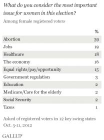 Nearly four in ten - 39% - of women said abortion is the most important issue in this election. Source: http://www.gallup.com/poll/158069/women-swing-states-gender-specific-priorities.aspx