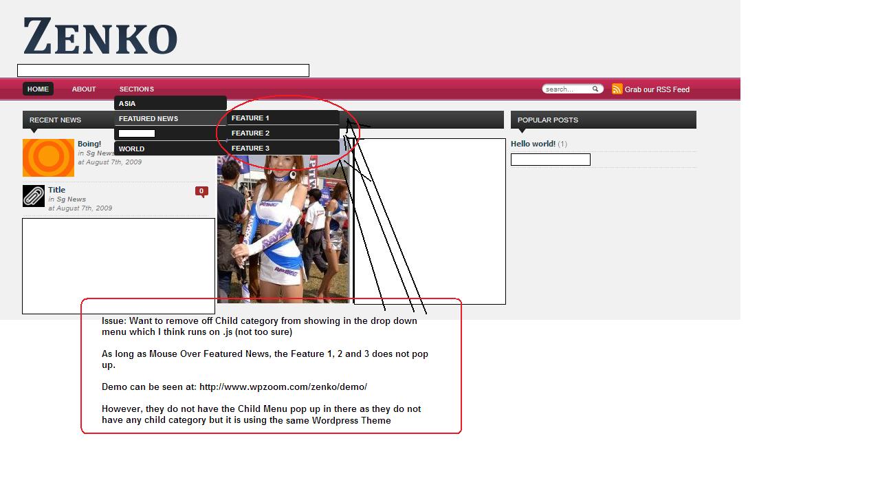 Hi I need some help in my wordpress theme drop down menu which can be seen in this demo page: http://www.wpzoom.com/zenko/demo/ It is using the same wordpress theme but my site has Child Categories and I want to stop it from appearing in the drop down menu as can be seen in the picture. Please assist. Thank you This is the Menu.js file that I found in the theme sfHover = function() { if (!document.getElementsByTagName) return false; var sfEls = document.getElementById("nav").getElementsByTagName("li"); for (var i=0; i<sfEls.length; i++) { sfEls[i].onmouseover=function() { this.className+=" sfhover"; } sfEls[i].onmouseout=function() { this.className=this.className.replace(new RegExp(" sfhover\\b"), ""); } } } if (window.attachEvent) window.attachEvent("onload", sfHover); Code (markup):
