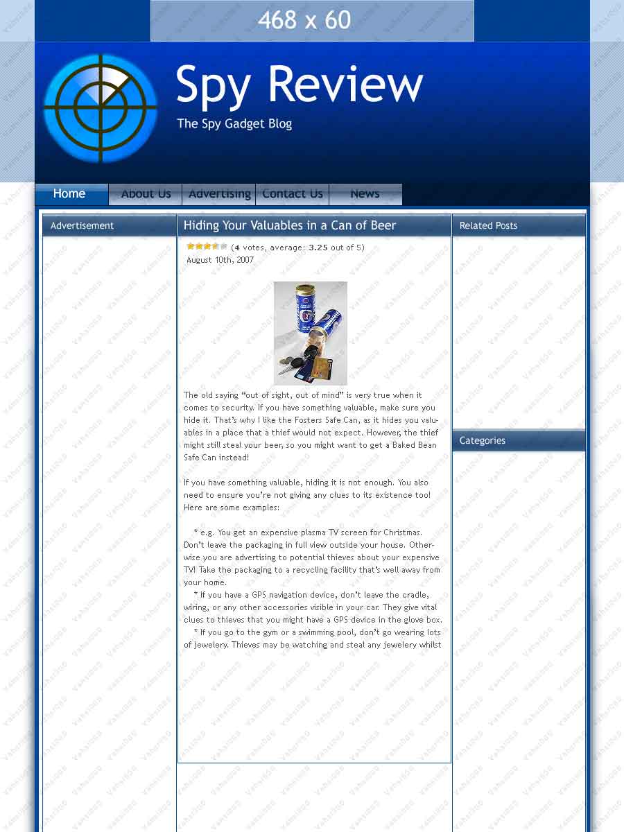 I have a popular gadget site that I want a brand new theme for: http://www.spyreview.co.uk I want a 3 column layout with 468 x 60 banner space near the header, a new logo with a faveicon.ico to match, a simple colour scheme based on blue, Web 2.0 style, but made clearly to be related to spy gadgets. Please PM a mockup or an idea of what you could do with the design. If you do not send a mockup, I will not be using your services. A mockup is a sign of commitment. I also want the option to provide revisions. Budget is midrange, but I am very specific about my requirements. Thanks