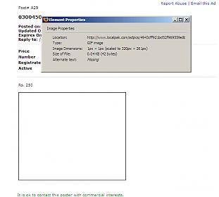 Hi, I am using X Zero Scripts Classified Script, I got a serious problem after installation, everything is working fine, I did installation as per installation manual, but issue is this when a user uploads the pictures it doesn't show up with the classifieds ads Here is the code that describes the configure file, please help // Number of ads/events and images to show per page $ads_per_page = 50; $images_per_page = 5; // Number of picture upload fields to show in post ad page $pic_count = 3; // Maximum size of pictures (in KB) $pic_maxsize = 200; // MIME types of files that are to be accepted as images $pic_filetypes = array("image/jpg", "image/jpeg", "image/pjpeg", "image/jpg", "image/png"); // Maximum height and width to which pictures uploaded // to the images category as well as those attached to // ads are to be resized $images_max_width = 800; $images_max_height = 800; // Thumbnail dimensions $tinythumb_max_width = 100; // Thumbnail in ad list $tinythumb_max_height = 50; $smallthumb_max_width = 160; // Left sidebar $smallthumb_max_height = 200; $thumb_max_width = 250; // Under images $thumb_max_height = 250; // The quality of the JPEG file after resizing (in %) $images_jpeg_quality = 75; But output is shown in attachment please help I really need it